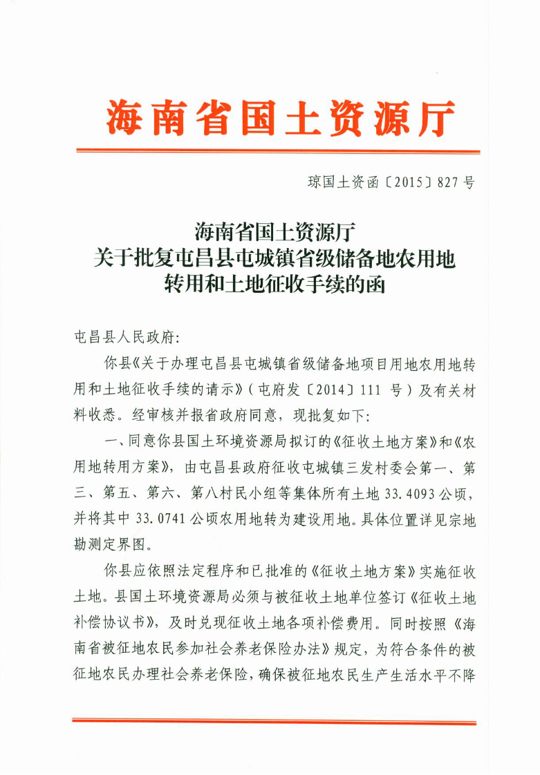 关于批复屯昌县屯城镇省级储备地农用地转用和土地征收手续的函