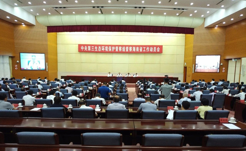 为深入贯彻落实习近平生态文明思想,经党中央、国务院批准,中央第三生态环境保护督察组近日进驻海南省开展生态环境保护督察。7月14日,中央第三生态环境保护督察组对海南省开展生态环境保护督察工作动员会在海口召开,督察组组长蒋巨峰、副组长赵英民就做好督察工作分别作了讲话,海南省委书记刘赐贵作了动员讲话,会议由海南省长沈晓明主持。