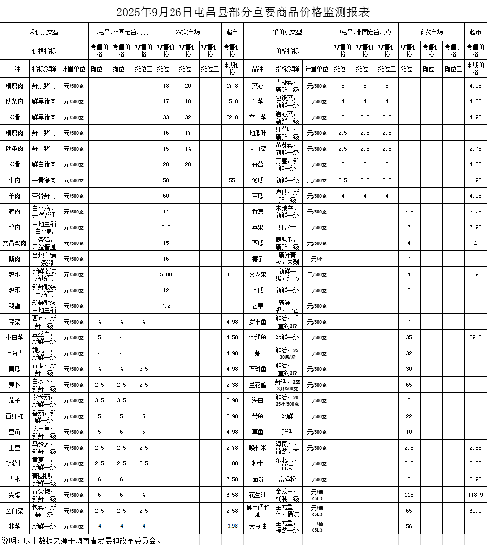 屯昌县部分重要商品价格监测表(2025年9月26日)