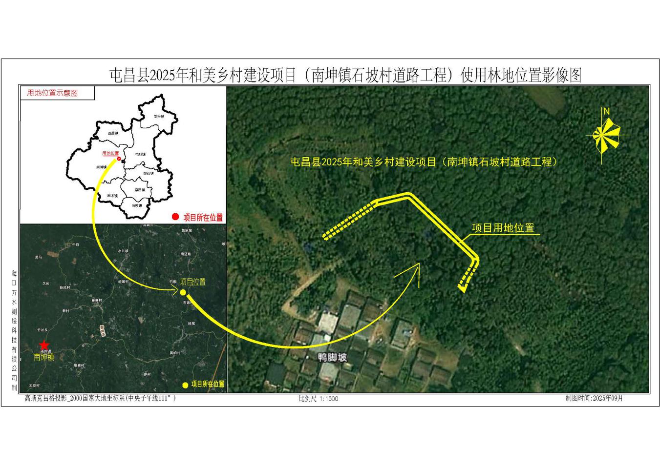 屯昌县2025年和美乡村建设项目(南坤镇石坡村道路工程)位于屯昌县南坤镇石坡村委会第六村民小组。(详见附件:项目使用林地位置示意图)。